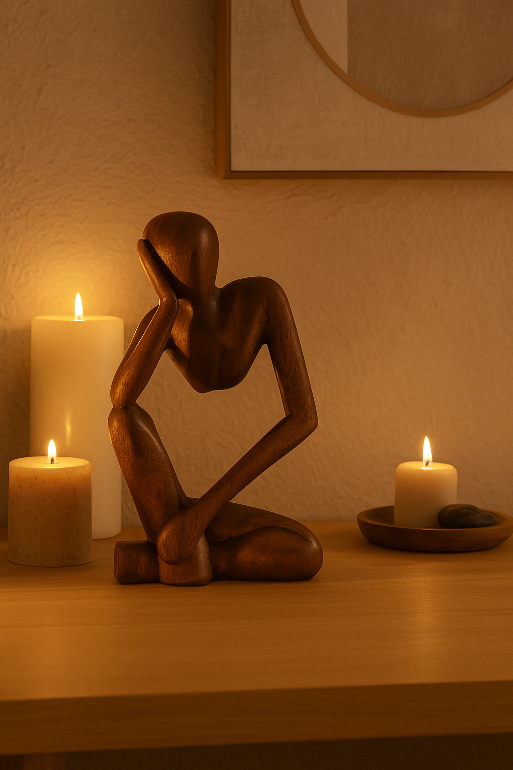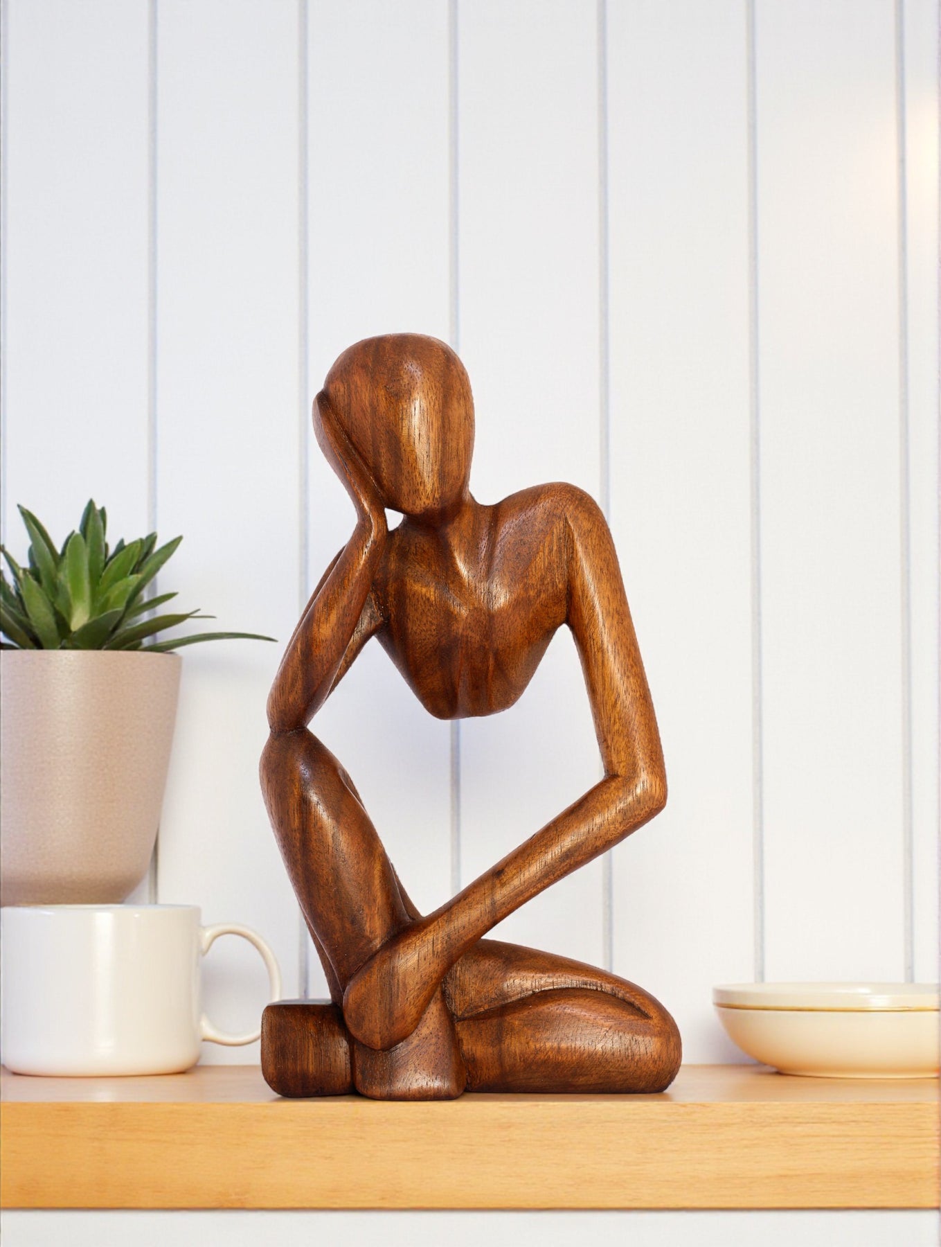 12" Wooden Handmade Abstract Sculpture Statue Handcrafted "Thinking Man" Gift Art Decorative Home Decor Figurine Accent Decoration Artwork Hand Carved