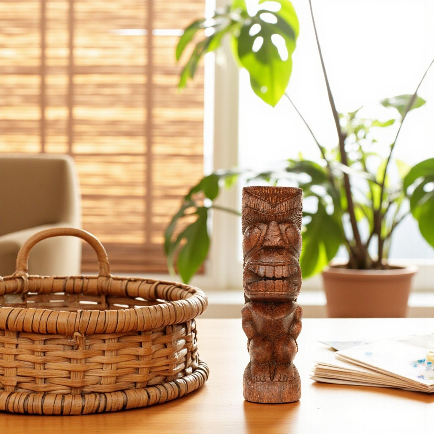 Decorated with intricate carvings that symbolically represent varying aspects of island life and reasons to luau, totem poles and tiki sculptures have long been synonymous with Hawaiian culture. Bring the laid-back vibes of Hawaii to your desk or shelf by displaying this wooden tribesman statue hand-carved from natural suar wood.