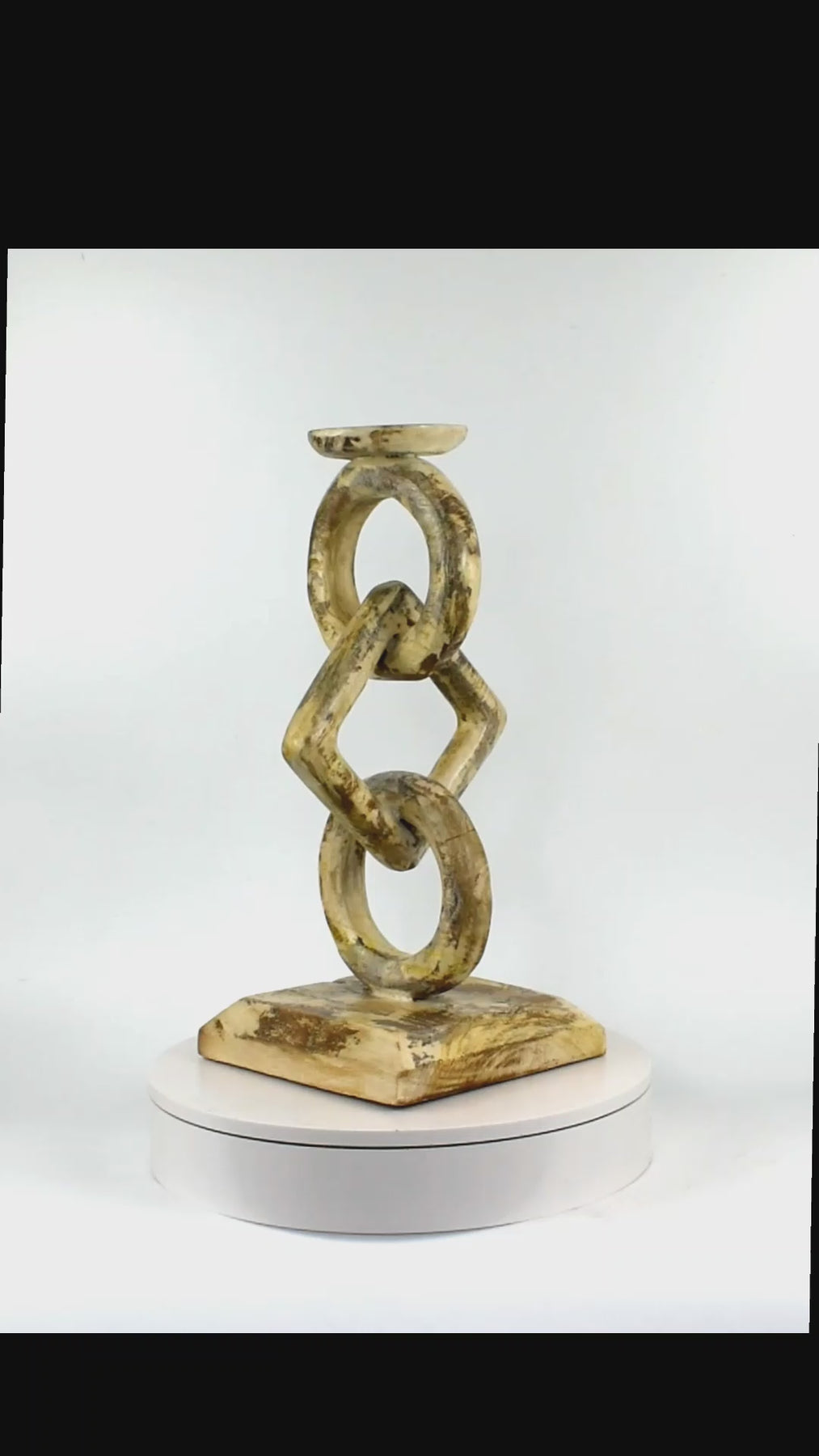 Add a sculptural touch to your decor with this unique hand carved wood candle holder. Featuring two circular links and a square link stacked vertically, this piece combines modern geometric style with rustic charm. The whitewashed finish enhances the natural wood grain while giving it a weathered, vintage feel. Perfect for dining tables, mantels, or sideboards, it makes a stunning centerpiece whether topped with a candle or displayed as art.