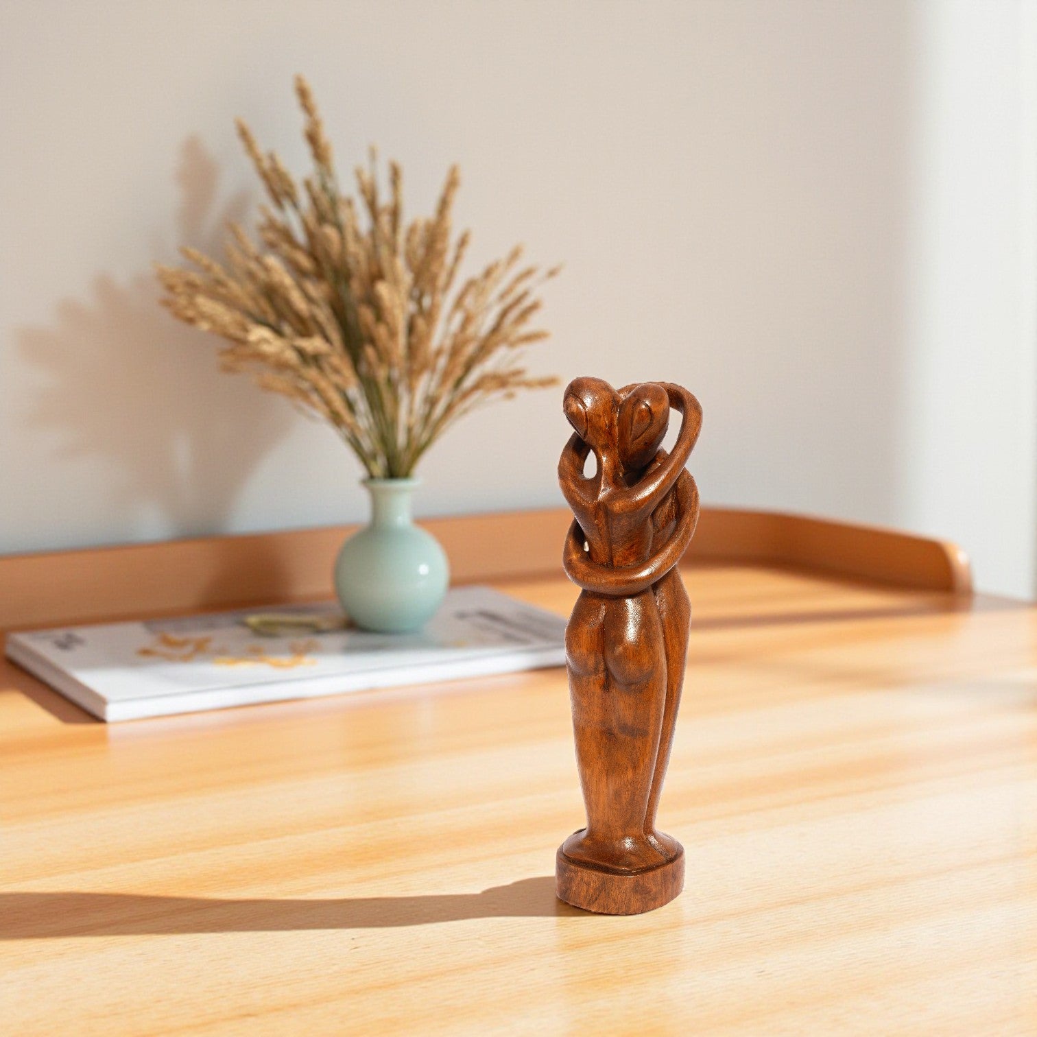 This exquisite piece is handcrafted in suar wood and depicts a man and woman, enfolded in a loving embrace. The couple stand upon a small wooden platform, their pose portraying love will last forever and will never end. The statue is beautifully polished, highlighting the grain and color of the suar wood to perfection. The smooth lines and deep mahogany color are sure to add warmth and style to any contemporary home or it would be the perfect gift for any couple.