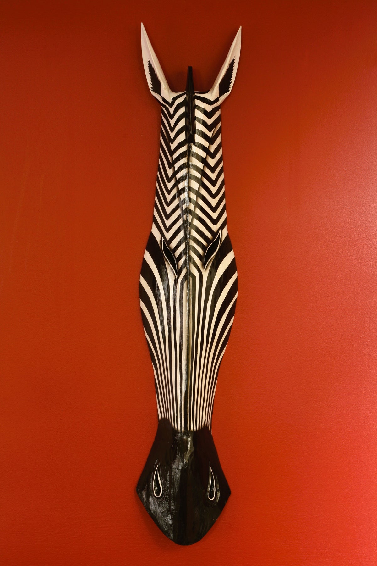 Bring bold African-inspired artistry into your home with this stunning hand-carved wooden zebra mask. Featuring a full zebra head profile with dramatic V-shaped black and white stripes, this piece adds striking contrast and cultural charm to any wall.