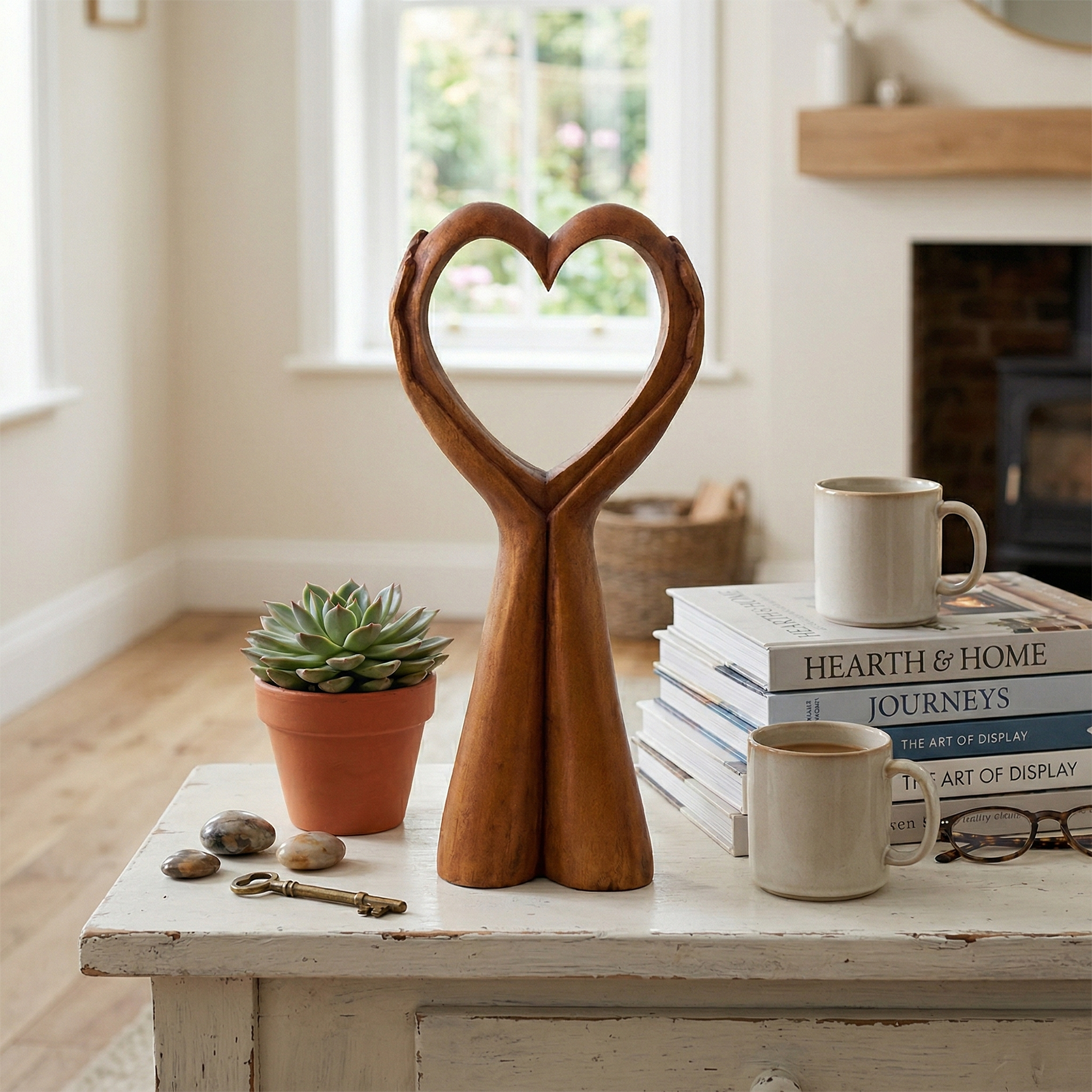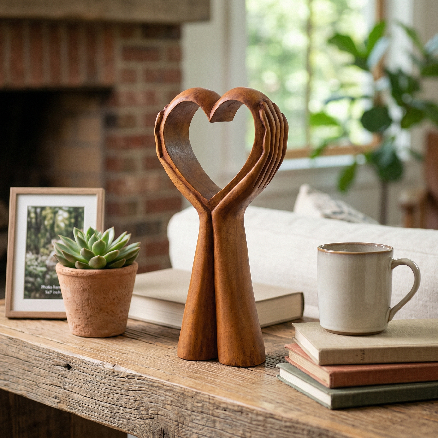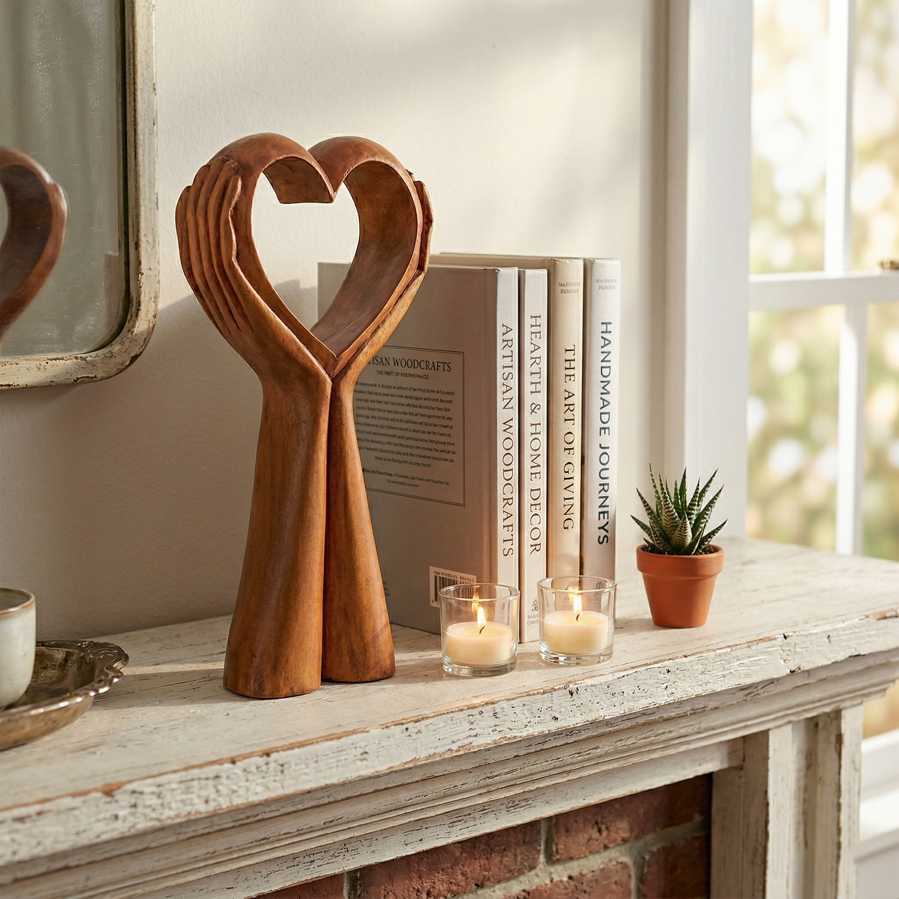Love knows no borders. Love will always win. Bring a loving energy to your desk, shelf, table or counter top with a wooden figurine lovingly carved by hand. The open heart statue is formed out of hands coming together to create the iconic shape universally understood across the globe.